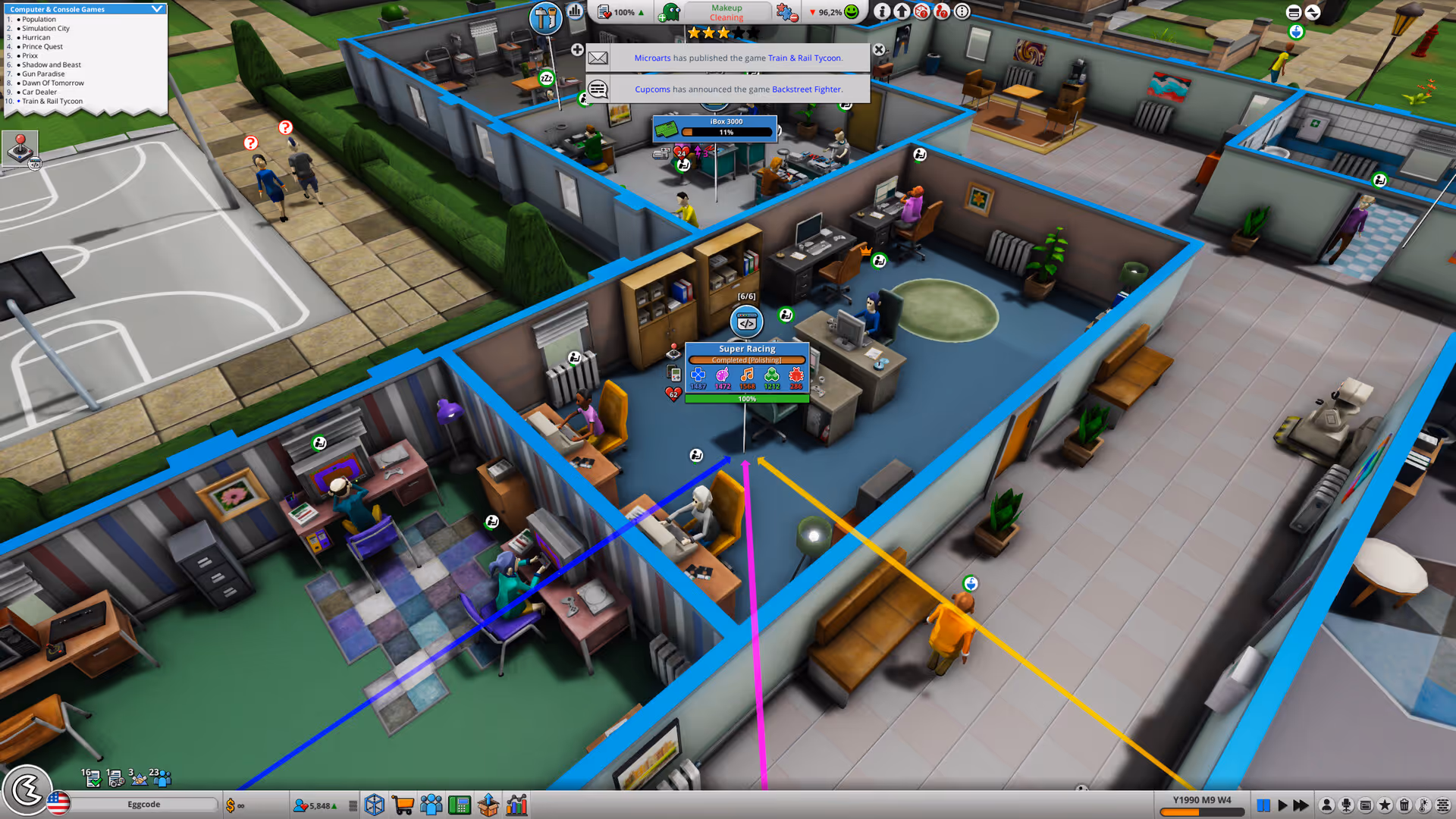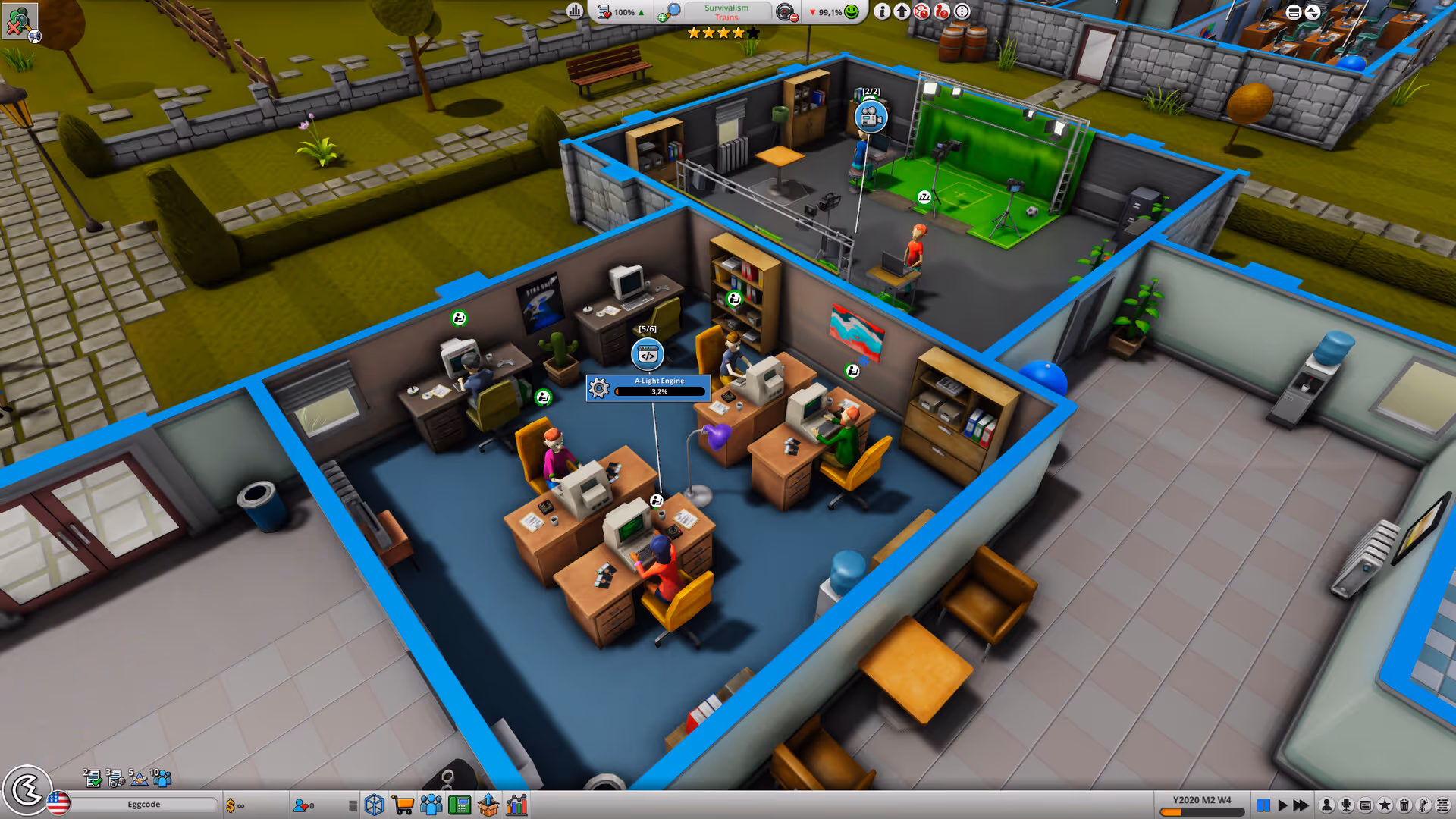 • Staff management includes skill specialization, salaries, and production pipelines.