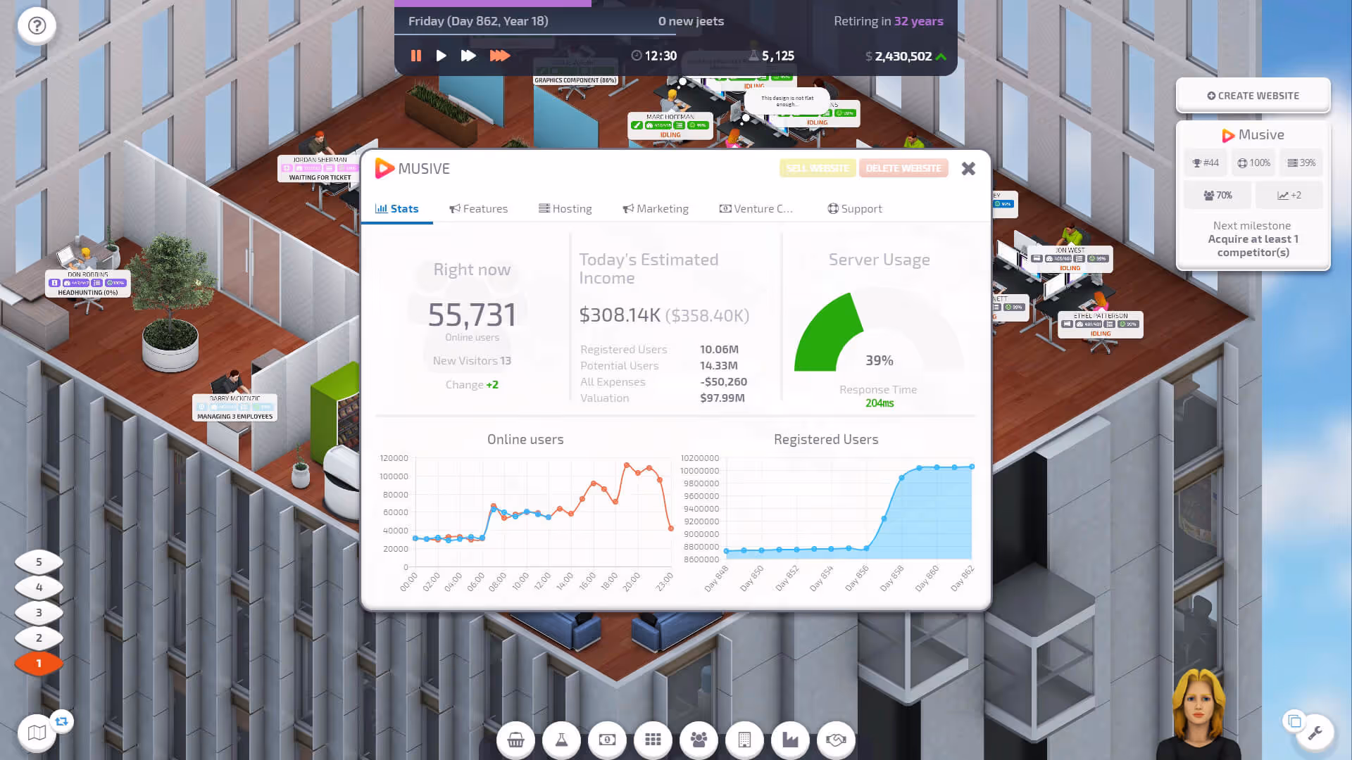 • Players must manage multiple systems including employee productivity, server infrastructure, and marketing.