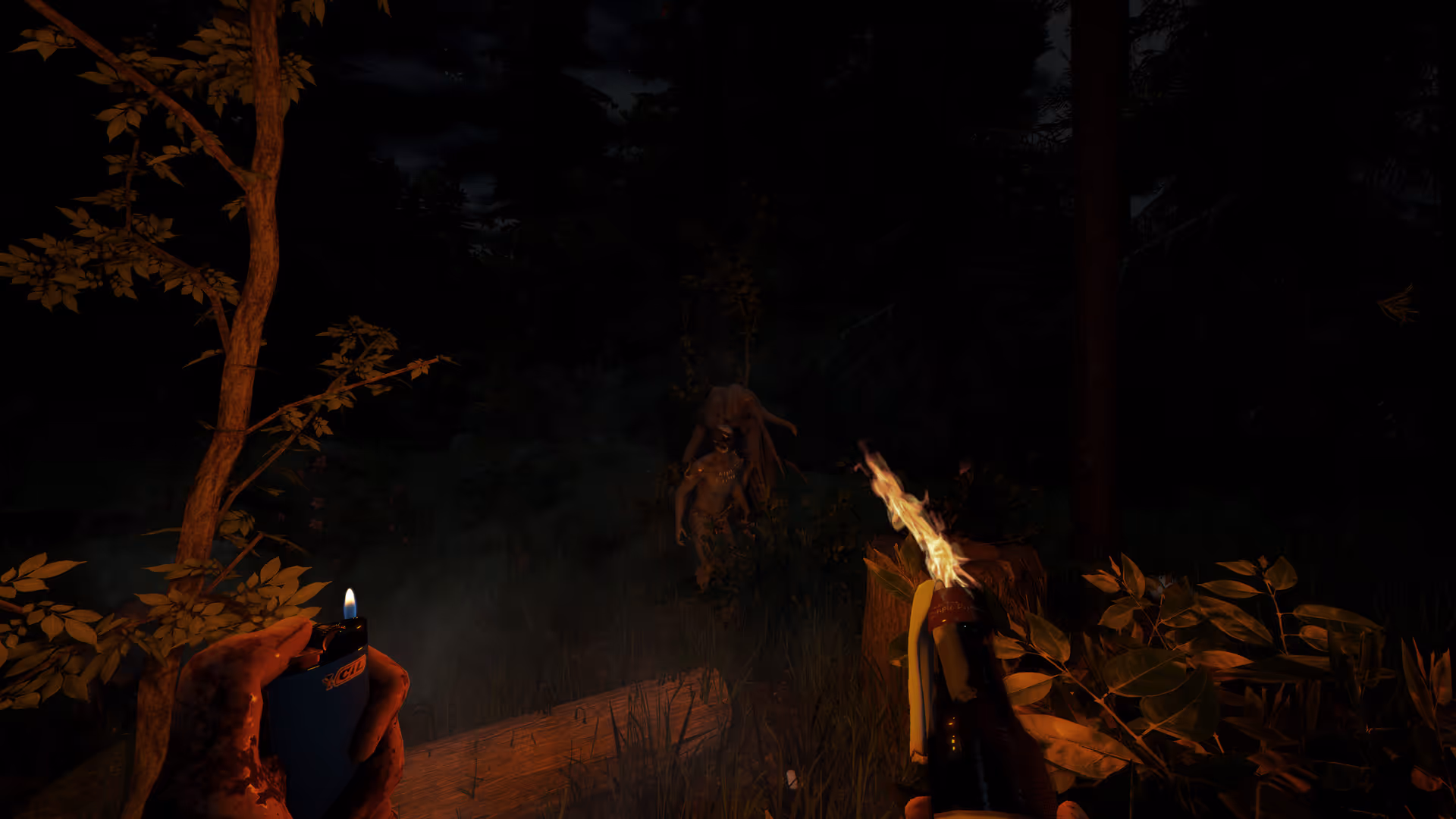 The Forest is a first-person survival horror game set on a remote island inhabited by hostile cannibalistic mutants. Players gather resources, craft tools and weapons, build shelters, and explore cave systems to uncover the mystery behind a plane crash. The core loop combines base building, survival management, and tense combat encounters that escalate over time. Its tone is oppressive and atmospheric, emphasizing isolation, environmental storytelling, and emergent threats.